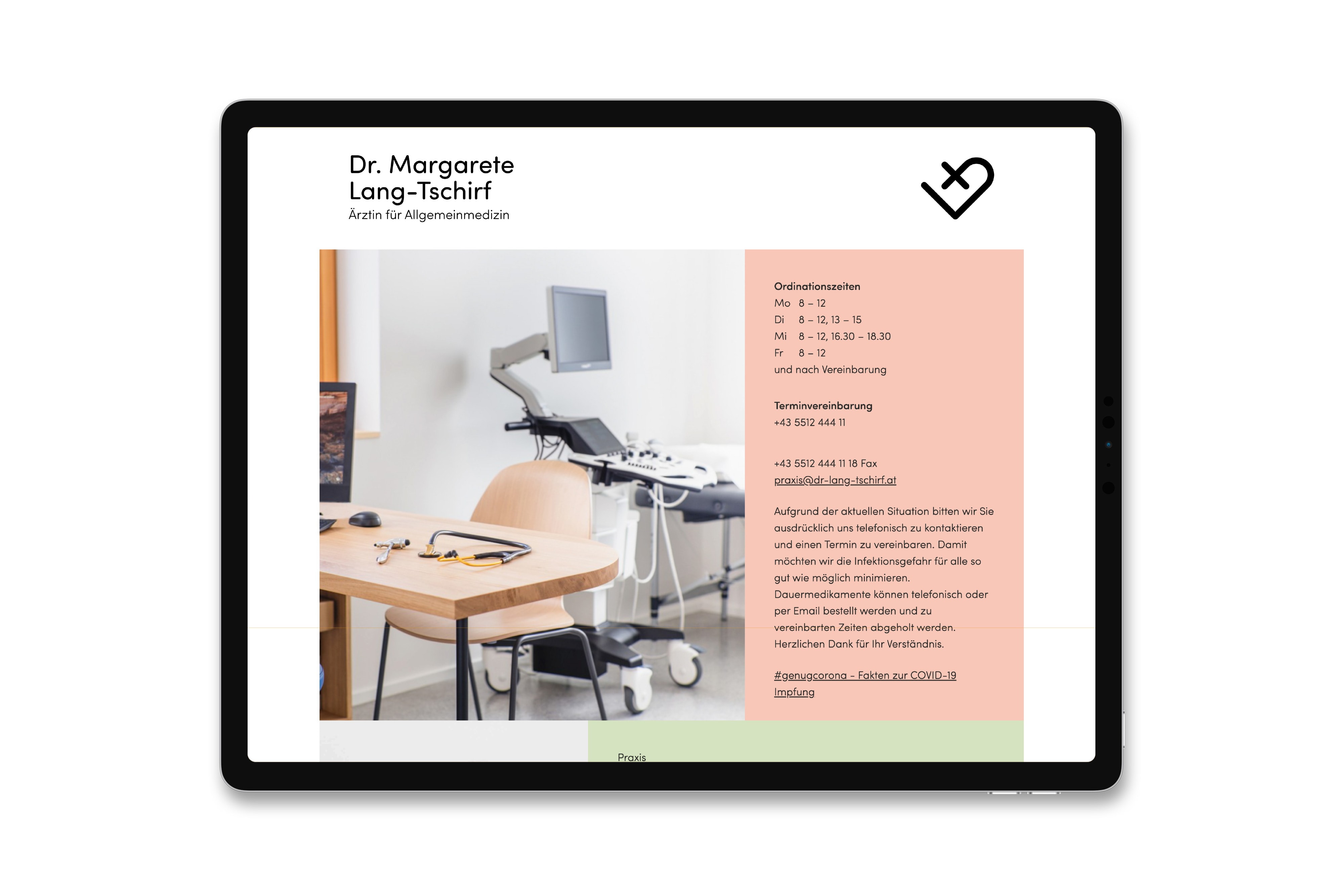 Die Gestalter:innen von Super BfG entwickelten mit Mathias Gmeiner eine simple informative Website die das Leistungsspektrum von Dr. Lang-Tschirf vermittelt und einen sympathischen Einblick in die Praxis bietet.