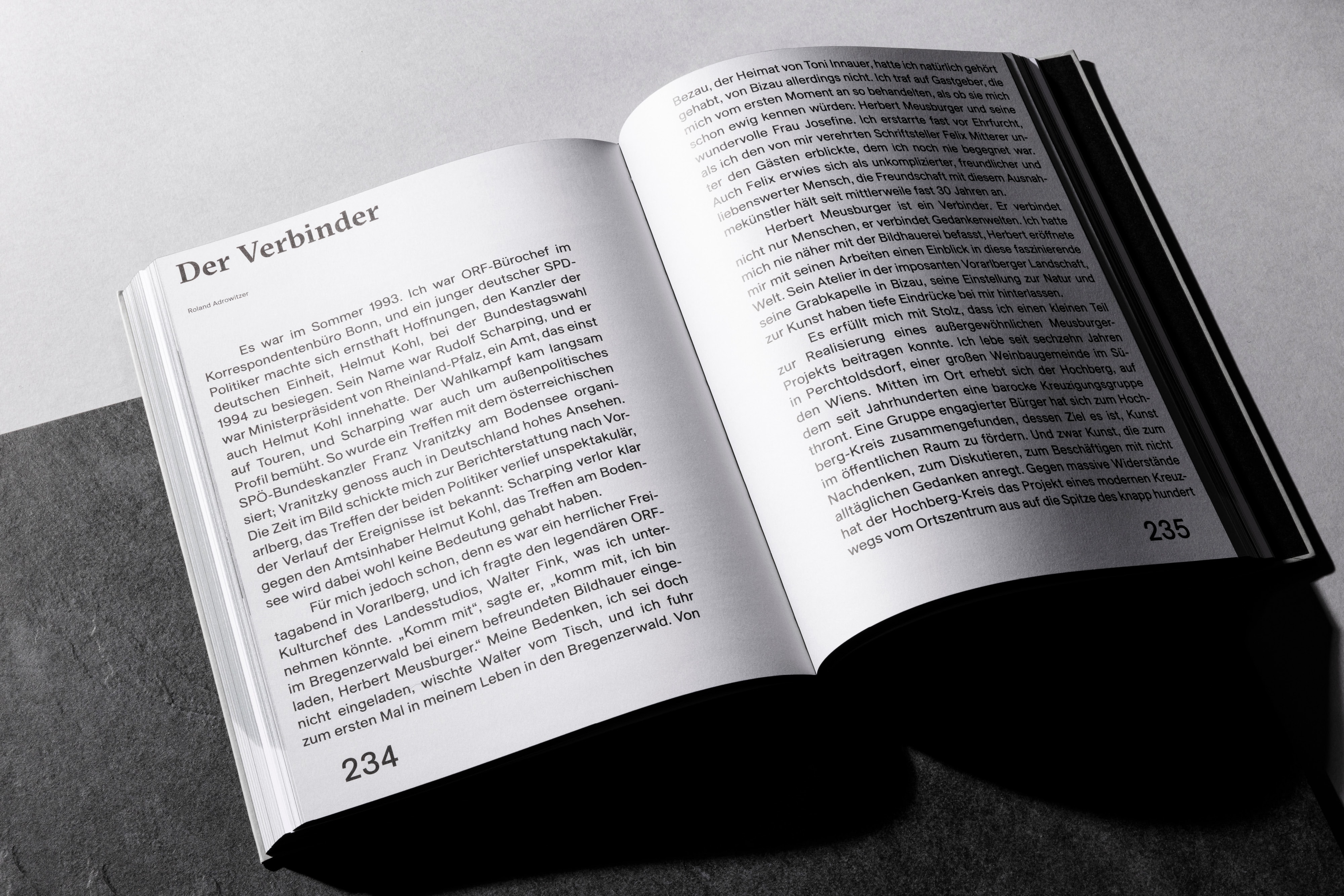 Für den Vorarlberger Künstler Herbert Meusburger gestaltete Super BfG eine umfassende Künstlermonographie, die Werk, Haltung und Persönlichkeit in einer klaren, zeitgemäßen Gestaltung zusammenführt. Das Buchprojekt zeigt grafisches Feingefühl, typografische Präzision und ein tiefes Verständnis für künstlerische Inhalte.