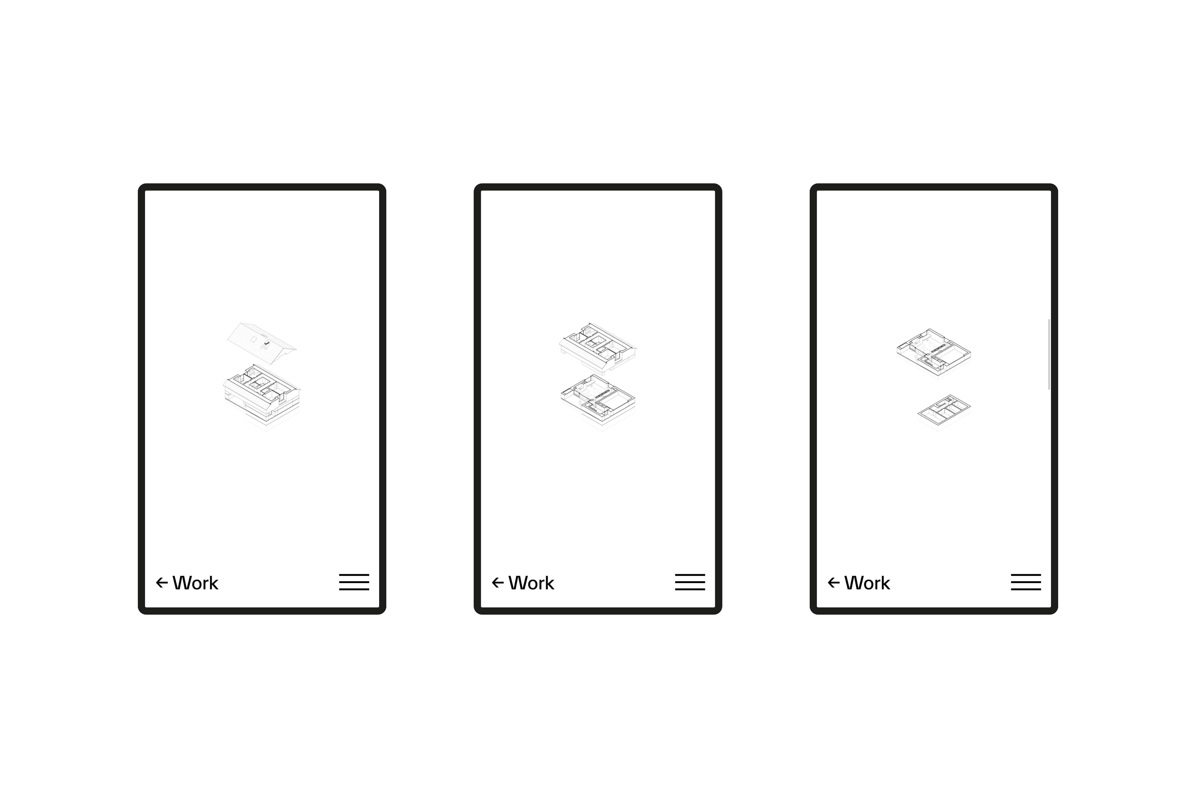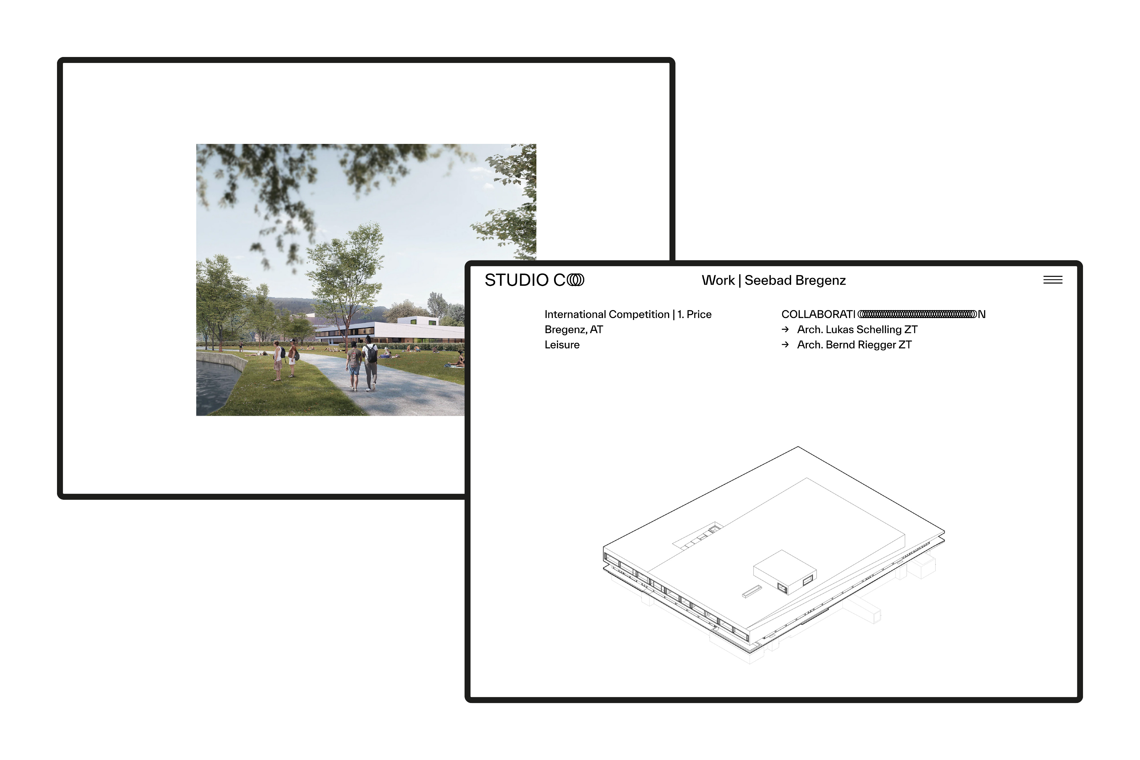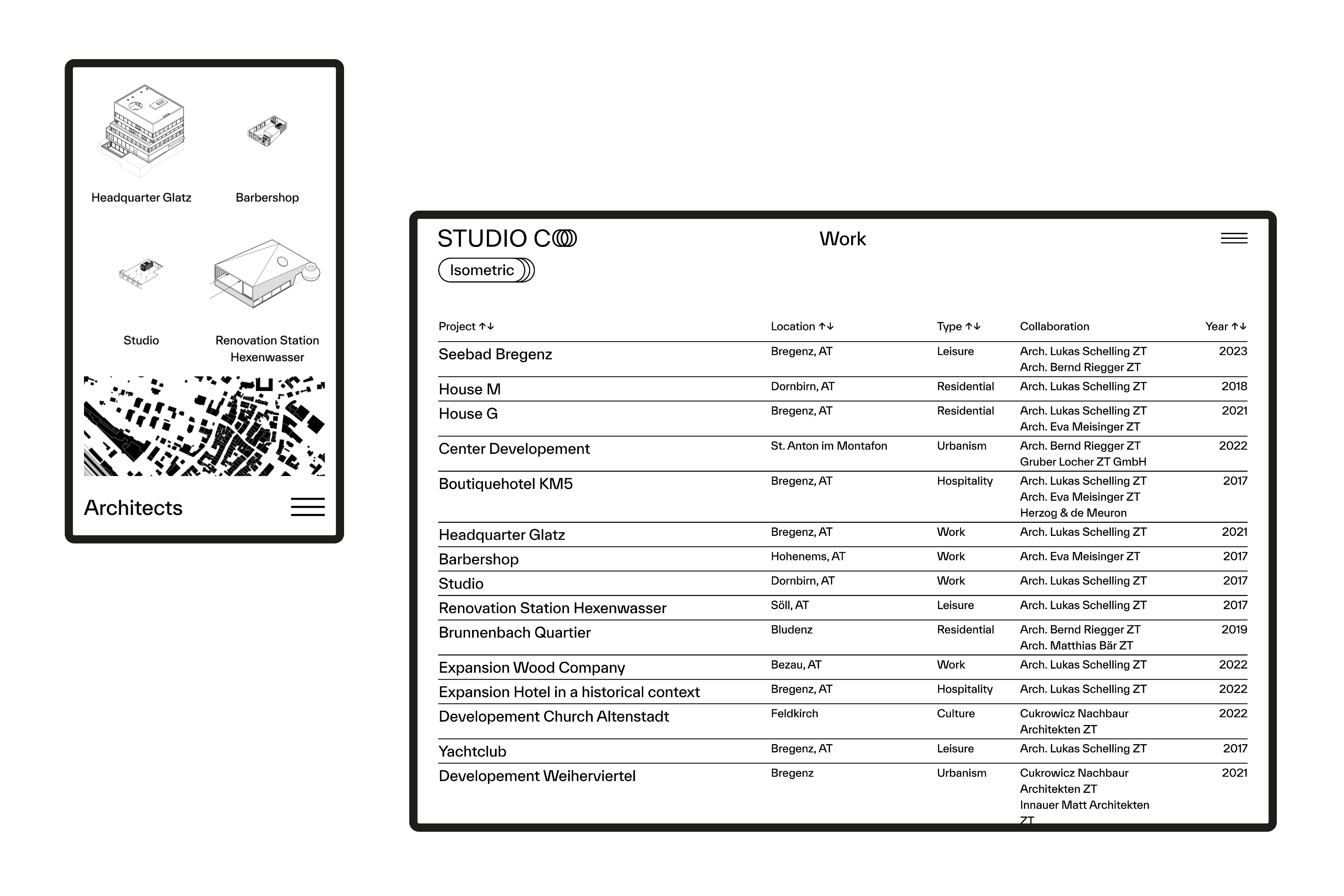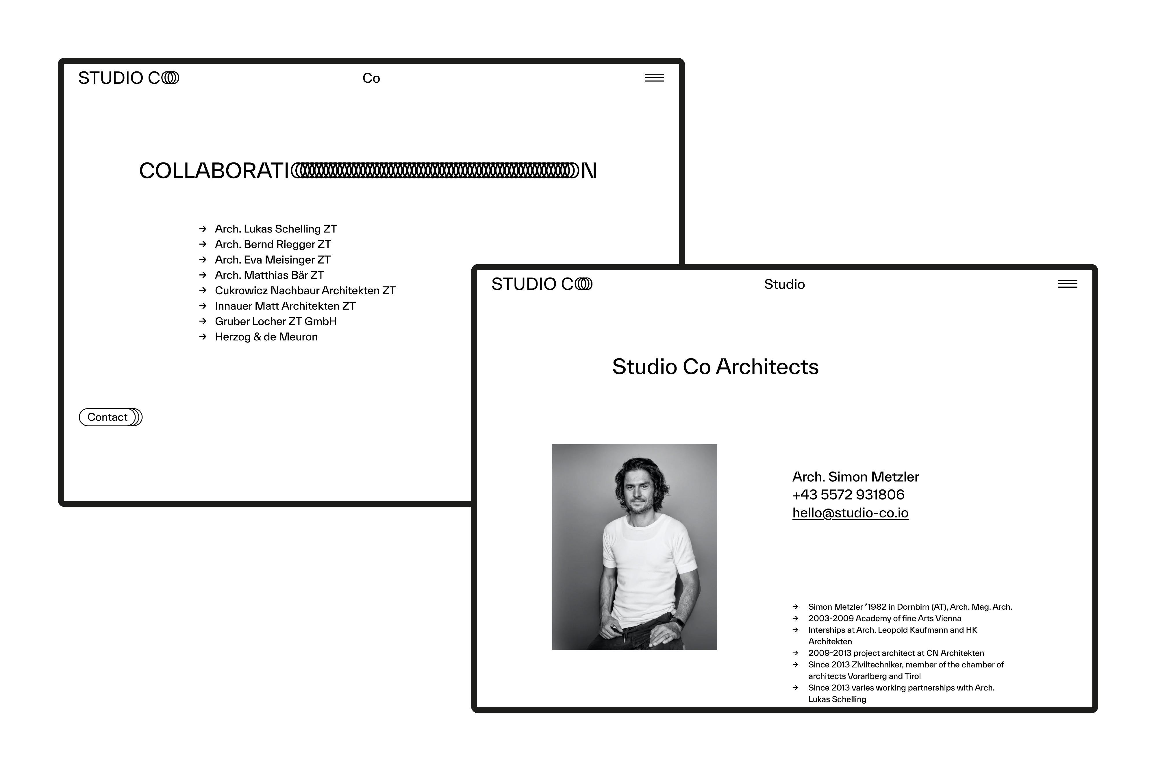 Architekt Simon Metzler arbeitet in kleinen wechselnden Teams. In verschiedenen Kooperationen nimmt er an Wettbewerben teil und setzt Gebäude im In- und Ausland um. Die Website studio-co.io zeigt ausgewählte Arbeiten und Studien aus seinem Wirken. Der Einstieg in die Projekte erfolgt über vereinfachte isometrische Darstellungen der Gebäude sowie Schwarzplänen bei räumlichen Studien. In der Projektansicht können die verschiedenen Ebenen bzw. Stockwerke als Scrollevent auseinander bzw. wieder ineinander verschoben.